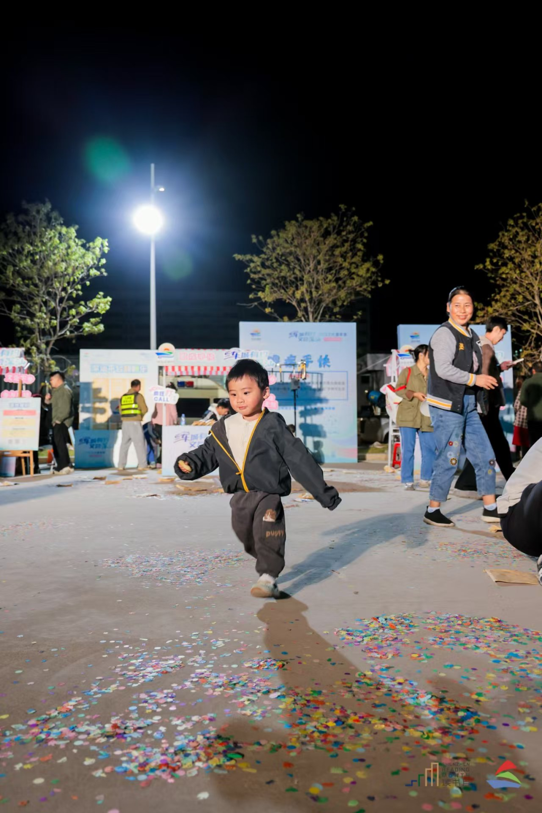 当夜幕完全降临,深圳大学乐队的登场将气氛推向高潮,穿插其间的“手抛纸创意”环节,漫天彩纸伴随着空气炮的轰鸣飘洒而下,人群中爆发出阵阵欢呼。集齐“深、物、汕、品”彩蛋的幸运儿,则喜滋滋地兑换到了独具深汕特色的文创礼品。