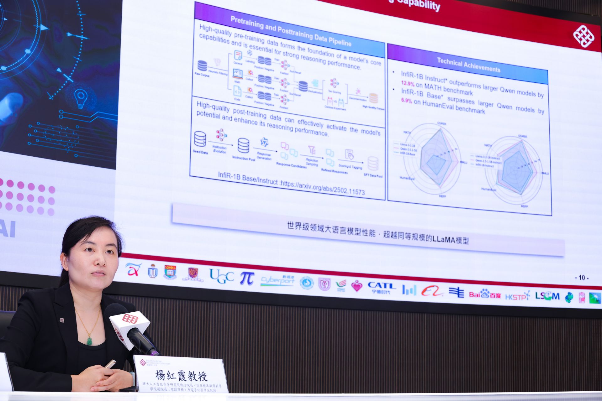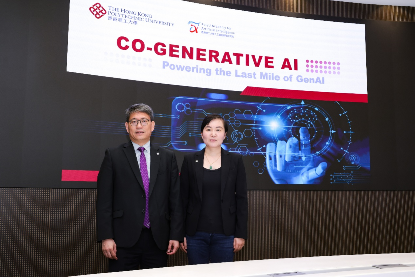 港理大高级副校长(研究及创新)赵汝恒(左)与PAAI执行院长、计算机及数学科学学院副院长(环球事务)、电子计算学系教授杨红霞(右)出席新闻发布会。