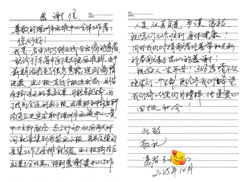 “生命救援显大爱,应急供血及时雨。”11月3日上午,急性髓系白血病患者王女士的家属再次来到深圳市血液中心,带来王女士写下的感谢信,以及广东省中医院输血科敬赠的一面锦旗。记者获悉,深圳市血液中心依托领先的血小板供者库与基因分型技术,血小板精准配型实现常态化,逐步形成可推广的区域性解决方案,可为长期输血患者提供可靠保障。