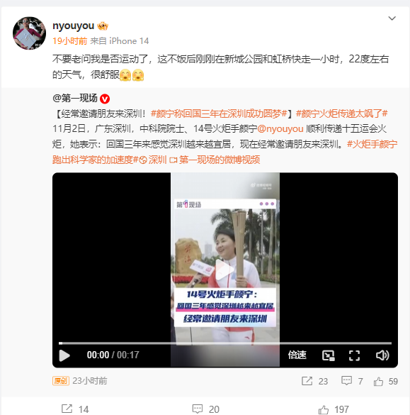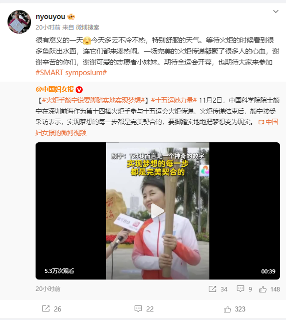 视频中,颜宁院长作为深圳第14棒正在传递全运会火炬。
