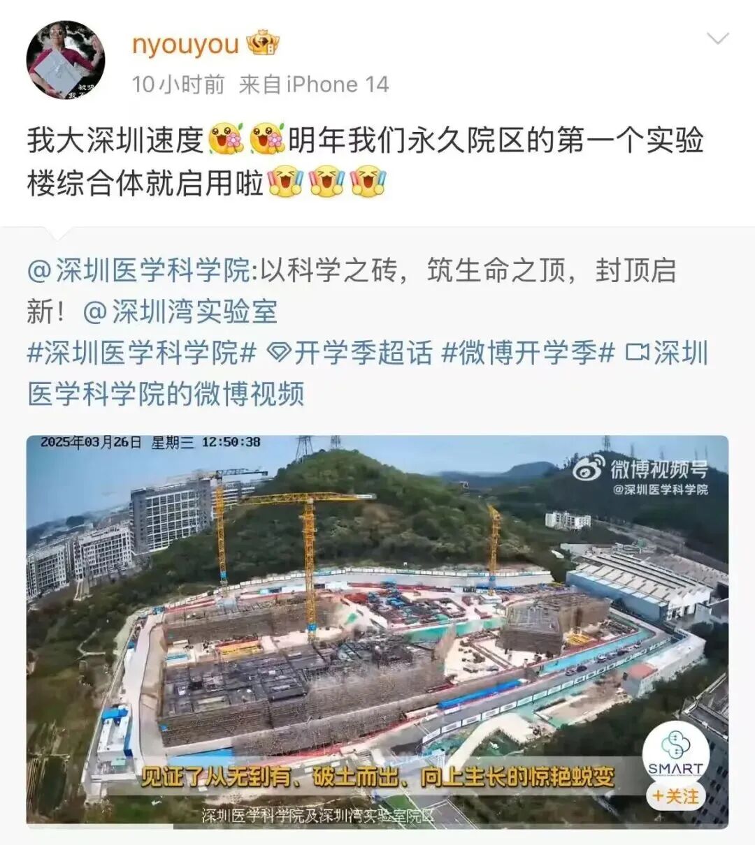 9月2日,深圳医学科学院创始院长、深圳湾实验室主任颜宁在微博转发相关视频并点赞:“我大深圳速度!明年我们永久院区的第一个实验楼综合体就启用啦!”