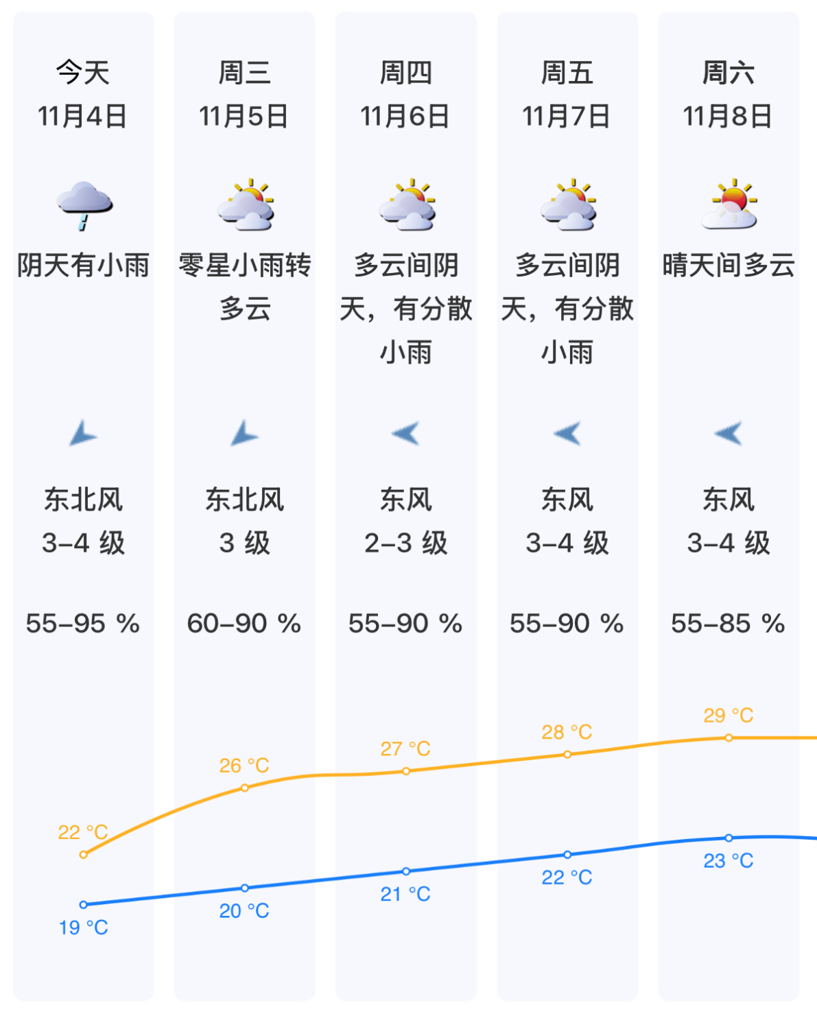 首先来看深圳本地。11月4日,深圳将是阴天间多云的天气,并伴有间歇性小雨。受冷空气和云层覆盖影响,气温将进一步走低,全天在19-22℃之间徘徊,日温差仅有3℃,体感会相当阴凉。沿海和高地还将有6级左右的东北阵风,市民朋友需注意适时添衣,并随身携带雨具。