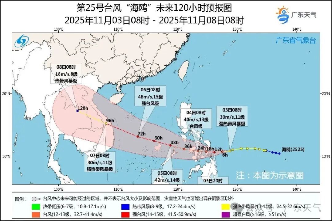 此外,今年第25号台风“海鸥”(强热带风暴级)将于5日移入南海,并可能加强为强台风级。虽然它对广东陆地无直接影响,但其外围环流将与冷空气配合,导致未来几天广东海面维持6-7级、阵风8-9级的东北大风,海上作业和航行需特别注意安全。