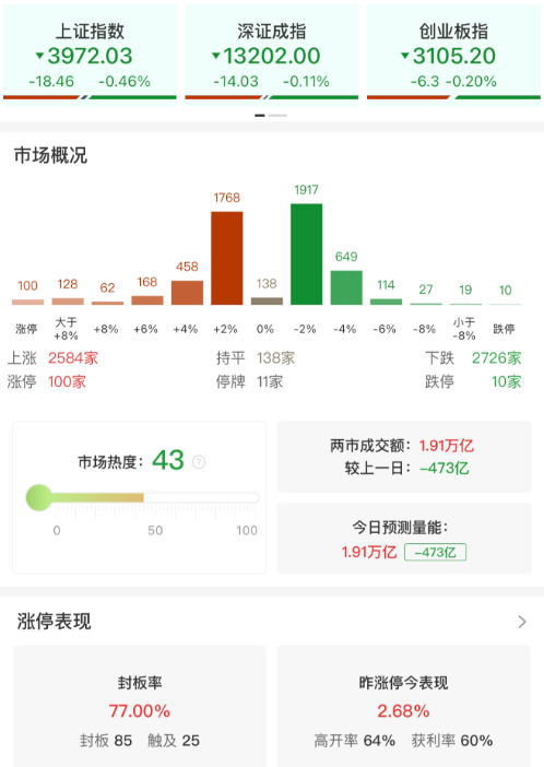 截至收盘,上证综指跌0.46%,报3972.03点;科创50指数跌0.53%,报1354.04点;深证成指跌0.11%,报13202点;创业板指跌0.2%,报3105.2点。