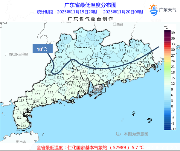 11月20日早晨,广东全省最低气温与昨天早晨基本接近,东部地区略有下降,西部稍有上升,粤北和珠江三角洲北部市县介于6~9℃之间,其中高海拔山区2~5℃,清远连山金子山顶录得全省极端低温0.0℃,其余市县10~13℃。