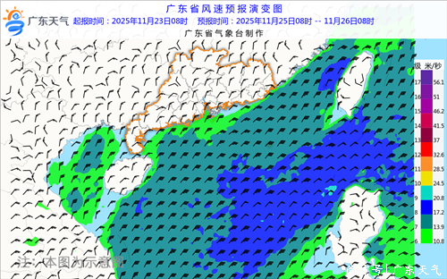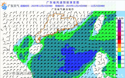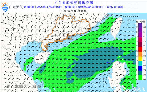 23日,粤西海面东北风5~6级阵风7级,我省中东部海面东北风6~7级阵风8级,逐渐减弱到5~6级阵风7级;