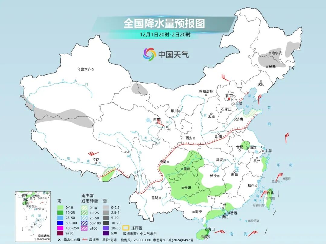 而南方的干燥终于有所缓解。今明两天,华南地区低空南风输送水汽,将带来小范围降雨。12月2日,南方降雨将短暂发展增多,出现成片小雨。