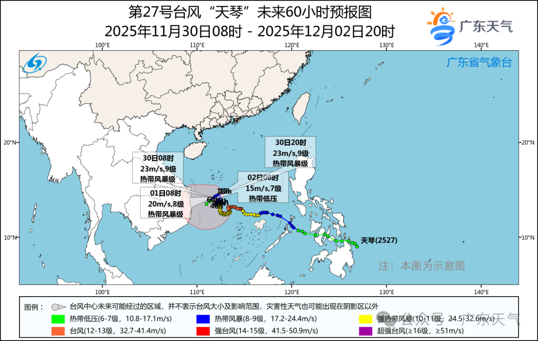 虽然台风“天琴”在南海回旋减弱,对广东无直接影响,但海面风力依然较大,南海中部及西南部海面阵风可达9级,海上作业需注意安全。