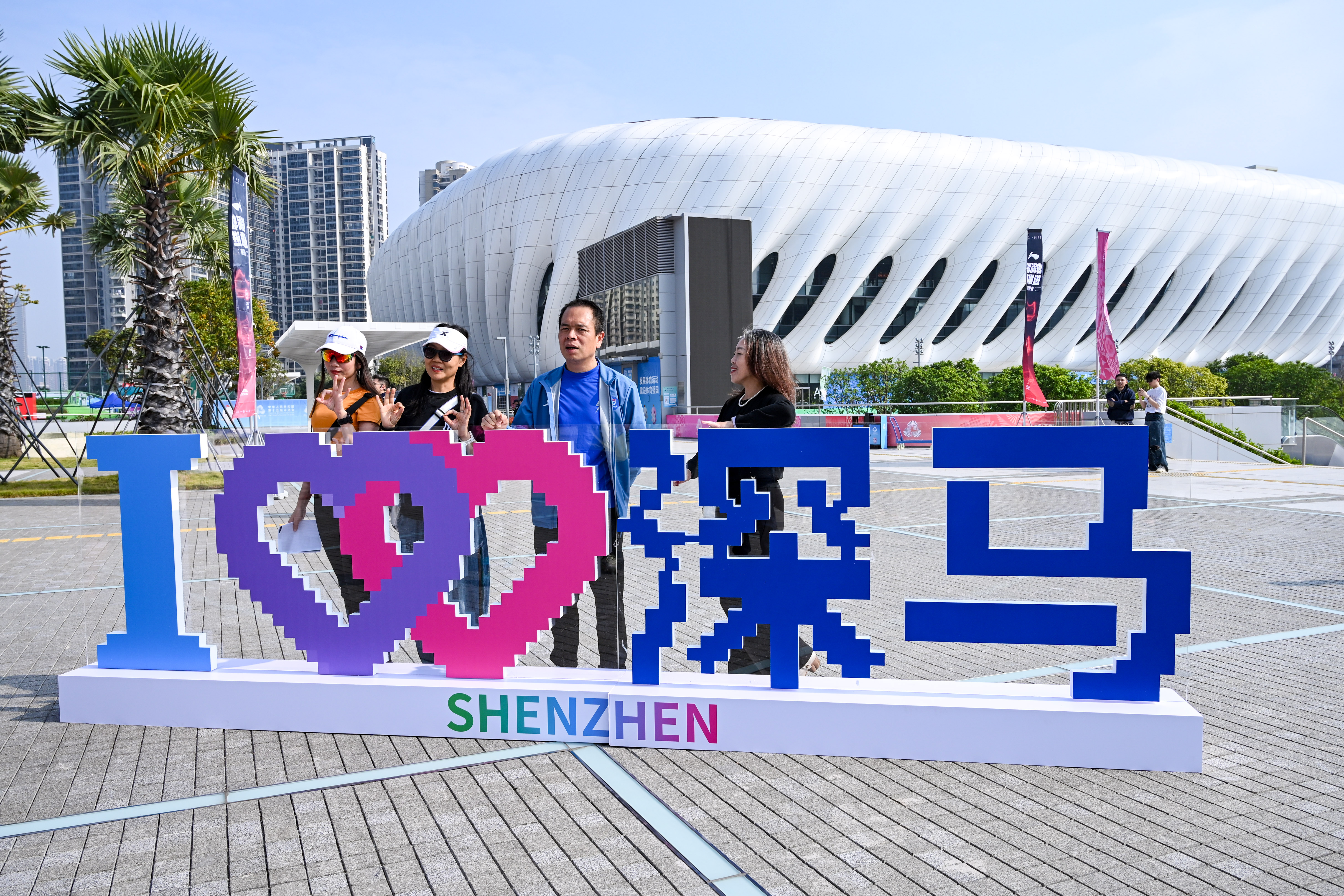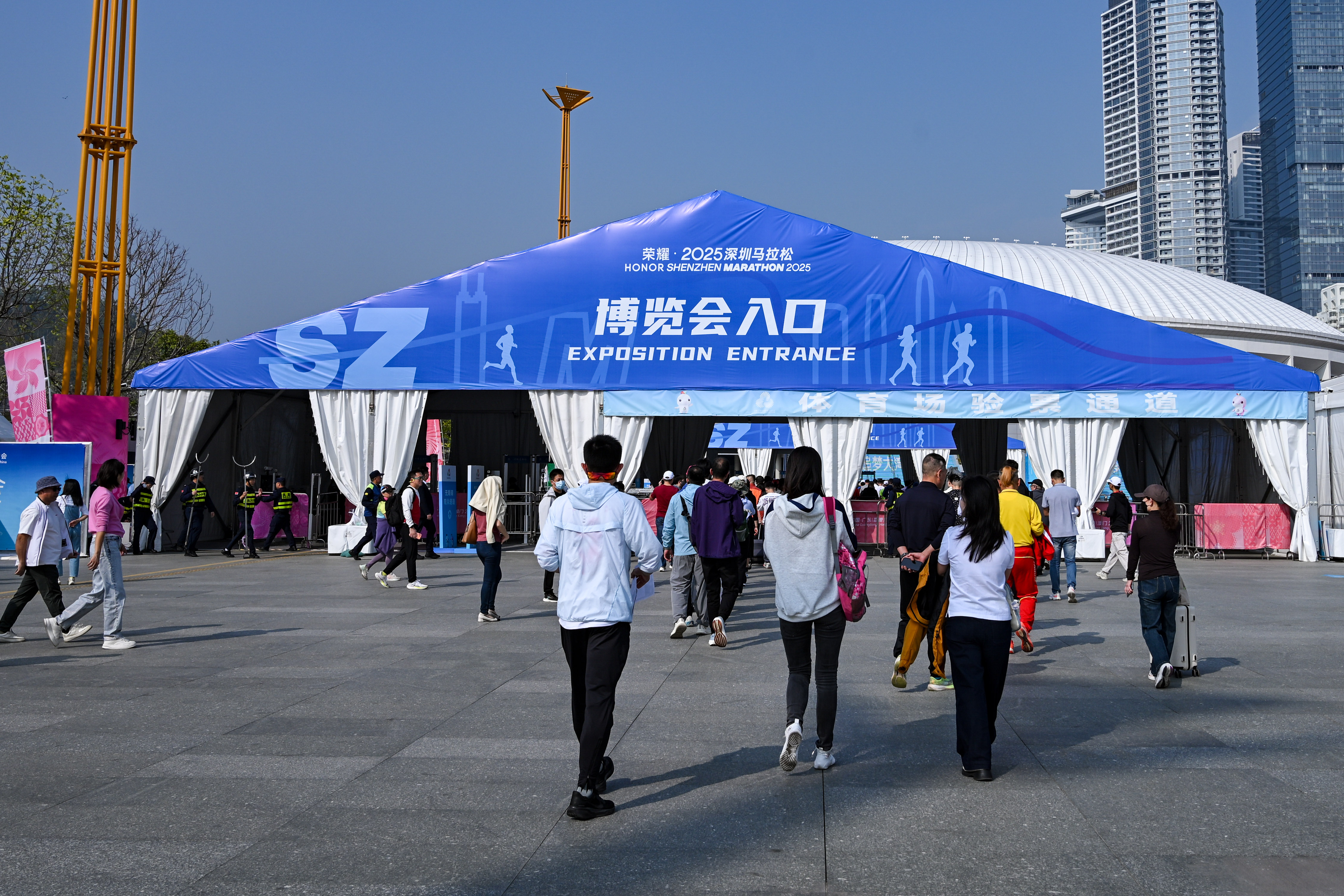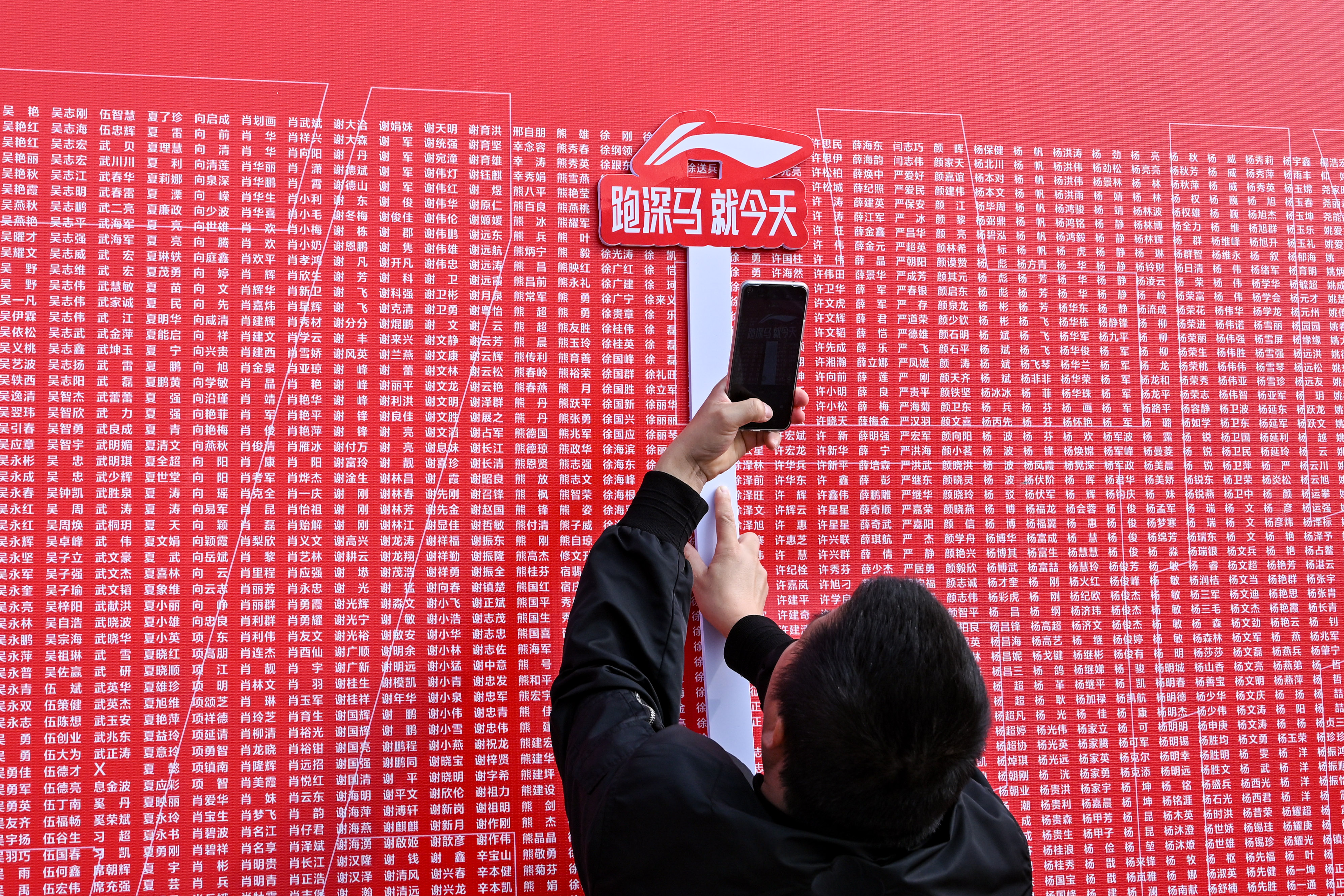 当天14时,跑者从深圳市体育中心南广场通过安检后,走进了位于深圳市体育中心体育场的深马博览会场地。丰富的赞助商展位让人目不暇接,不少赞助商更是拿出了诚意与福利,让参赛跑者、参观市民有更好的体验。博览会上一面红色的名字墙吸引了众多跑者注意——每位参赛跑者都能在上面找到自己的名字。大家拿着道具牌,与自己的名字打卡、拍照,仪式感满满。