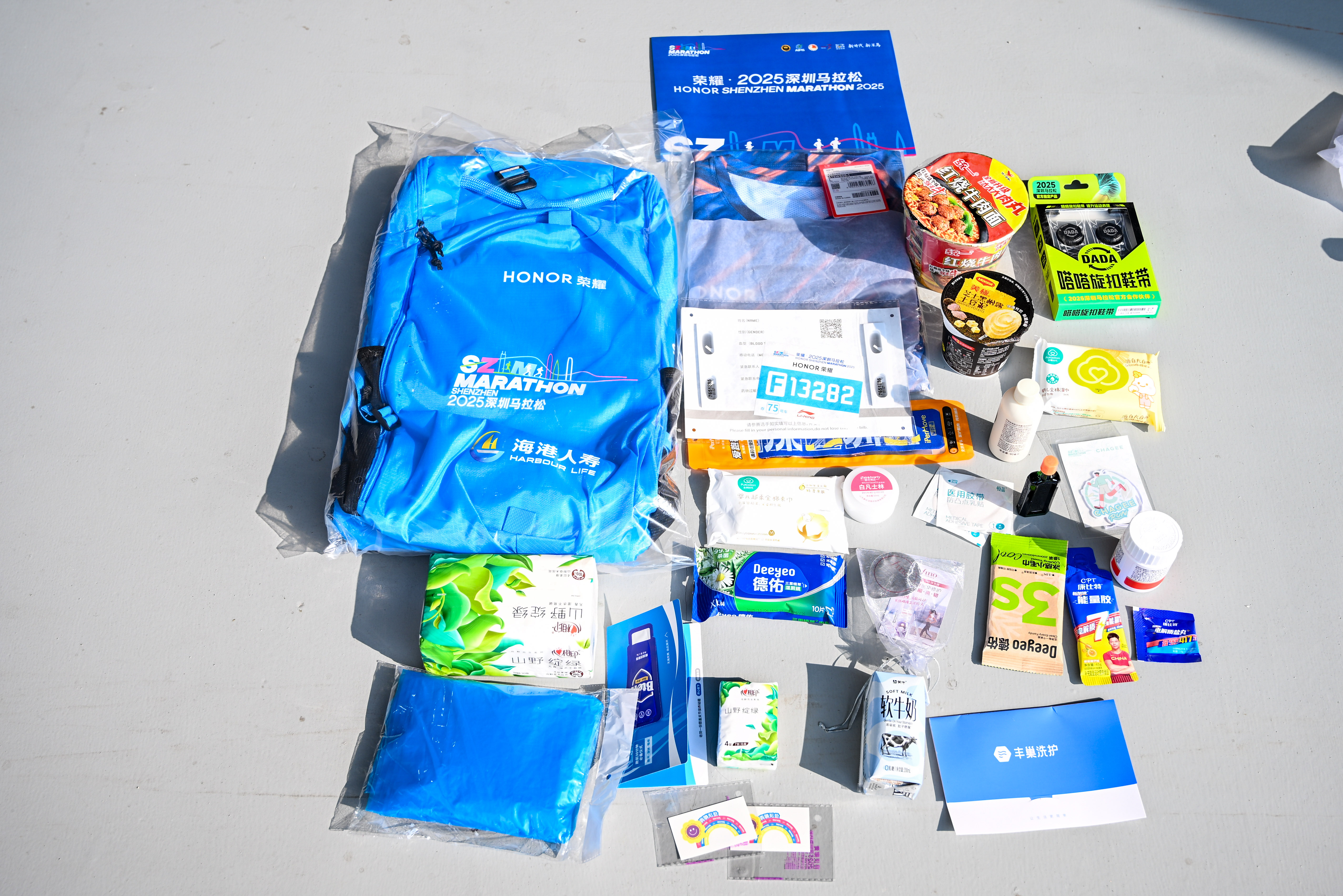 今年第三次参加深马的曾春辉早早拿到了自己的物资,背包、参赛服、旋扣鞋带、方便面、纸巾、凡士林、能量胶、雨衣、土豆泥……他在走道边上整理包里的物资,嘴角不禁上扬:“感觉自己像是来‘进货’的。”对曾春辉来说,最惊喜的就是参赛包:“之前看发布会的时候就觉得挺不错的,拿到手之后发现这个包不仅容量大,而且有很多分层,可以干湿分离,对我们跑者来说非常方便,以后去参加其他赛事也可以用。”