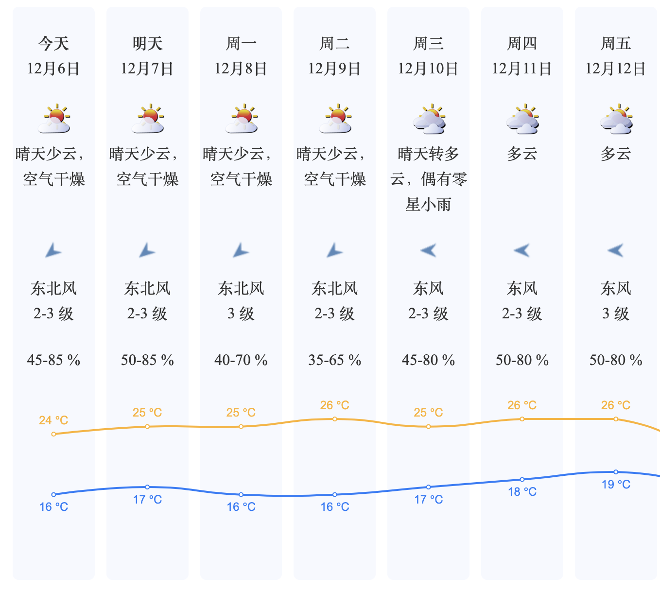 12月6日至8日,受弱冷空气频繁补充影响,广东大部以晴到多云为主,阳光相伴,气温缓慢回升。这对于想要洗晒衣物或计划秋游的朋友来说,绝对是个好消息。