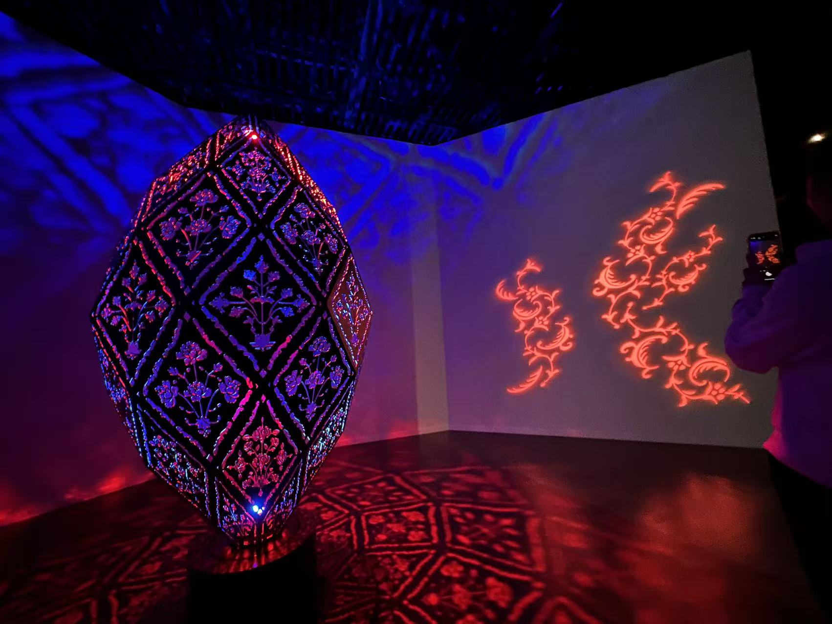 为让观众深度沉浸莫卧儿文明,展览在设计上暗藏巧思:展区以“权力”与“艺术”为主线、“昆丹工艺”为隐线,“艺术”展区采用多边形几何切割造型,呼应莫卧儿时期经典对称元素;大面积红绿对比色构建充满张力的叙事空间,搭配低反射玻璃与定制色温的专业珠宝灯光,打造“视觉真空”区域,让珍宝细节清晰呈现;设置展品衍生光影艺术装置“繁花秘境”和沉浸式光影艺术装置“泰姬陵·浮光幻彩”,为观众带来极致视觉体验,引发观众对展品的艺术化解读与情感共鸣。此外,深圳博物馆还联合深圳职业技术大学为展览配套安排“匠心对话:莫卧儿美学遇上设计之都深圳”区域,探索莫卧儿艺术与现代城市创意设计的共鸣。