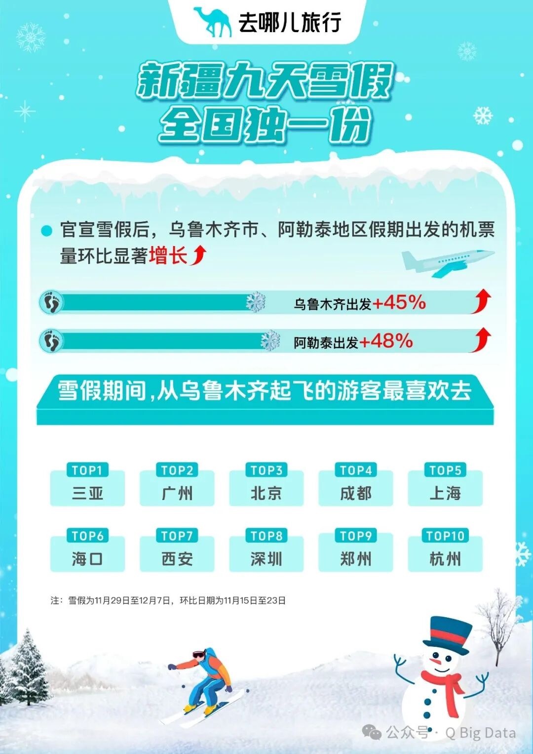 12月1日,新疆乌鲁木齐和阿勒泰地区的中小学生迎来首个“雪假”,放假时间为今年12月1日至5日,叠加前后双休日,当地学生最长假期可达9天。据去哪儿旅行数据显示,雪假带动两地出发的机票预订量环比增长都超过45%,尤其是飞往南方温暖城市的航线更受欢迎。从乌鲁木齐和长春起飞,游客的前十热门目的地中,深圳都有上榜!