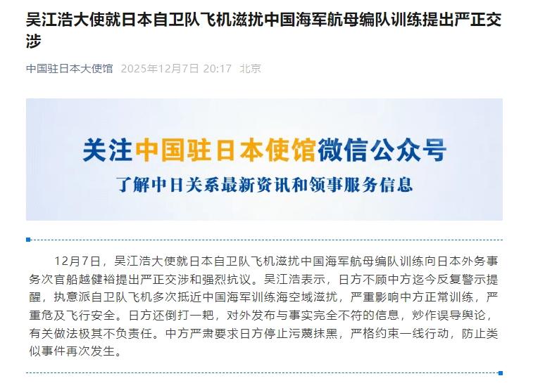 据中国驻日本大使馆消息,12月7日,吴江浩大使就日本自卫队飞机滋扰中国海军航母编队训练向日本外务事务次官船越健裕提出严正交涉和强烈抗议。吴江浩表示,日方不顾中方迄今反复警示提醒,执意派自卫队飞机多次抵近中国海军训练海空域滋扰,严重影响中方正常训练,严重危及飞行安全。日方还倒打一耙,对外发布与事实完全不符的信息,炒作误导舆论,有关做法极其不负责任。中方严肃要求日方停止污蔑抹黑,严格约束一线行动,防止类似事件再次发生。