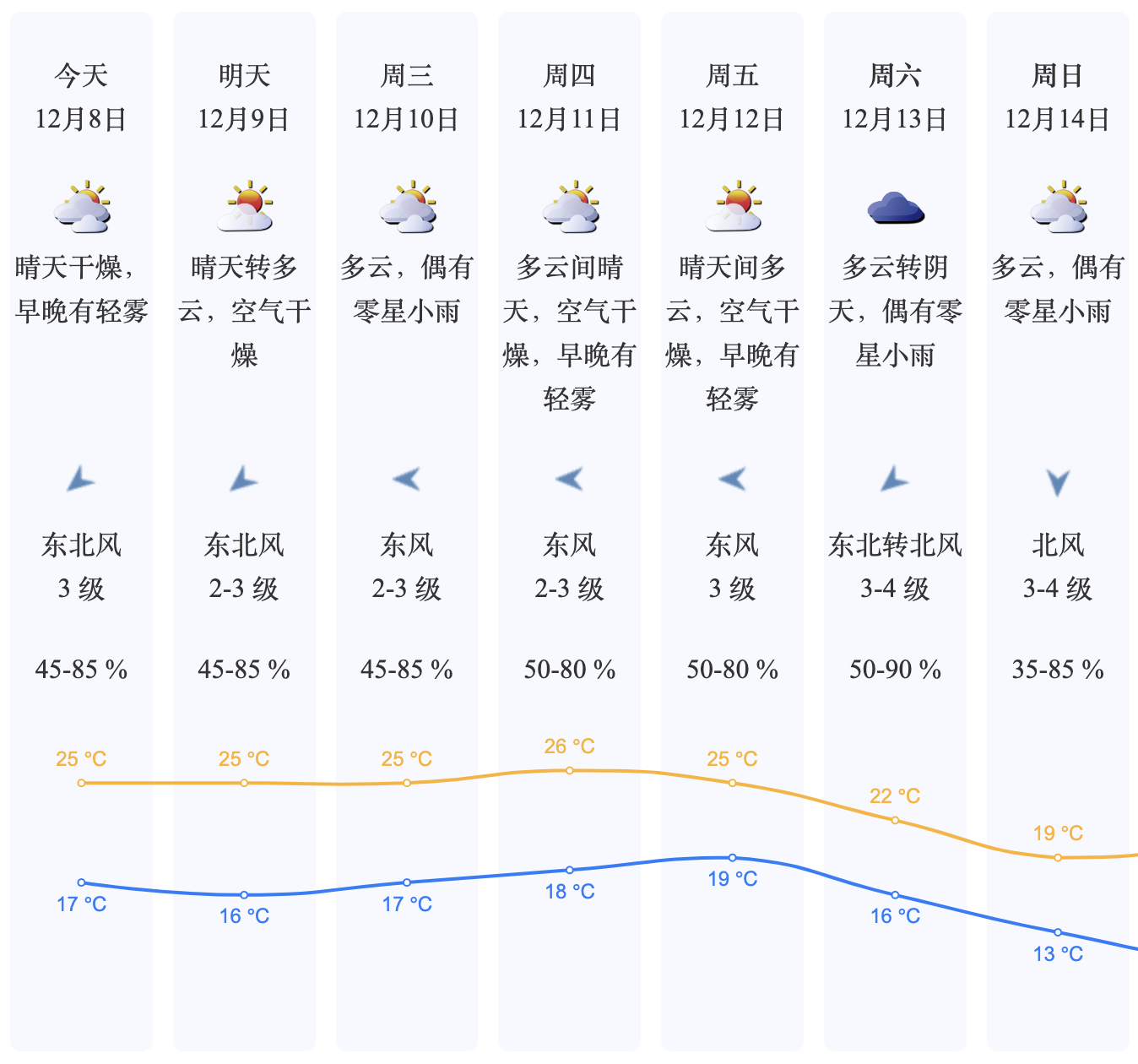 首先来看深圳本地。12月8日,深圳将延续晴天干燥的格局,早晚伴有轻雾,气温介于17-25℃之间。