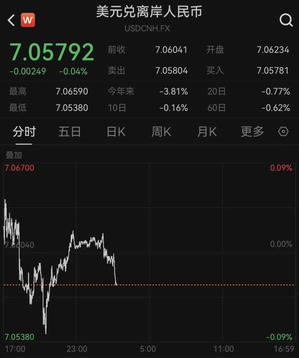 更多反映国际投资者预期的离岸人民币对美元汇率较前一交易日进一步升值,盘中最高升至7.0538,创下2024年10月9日以来的新高。