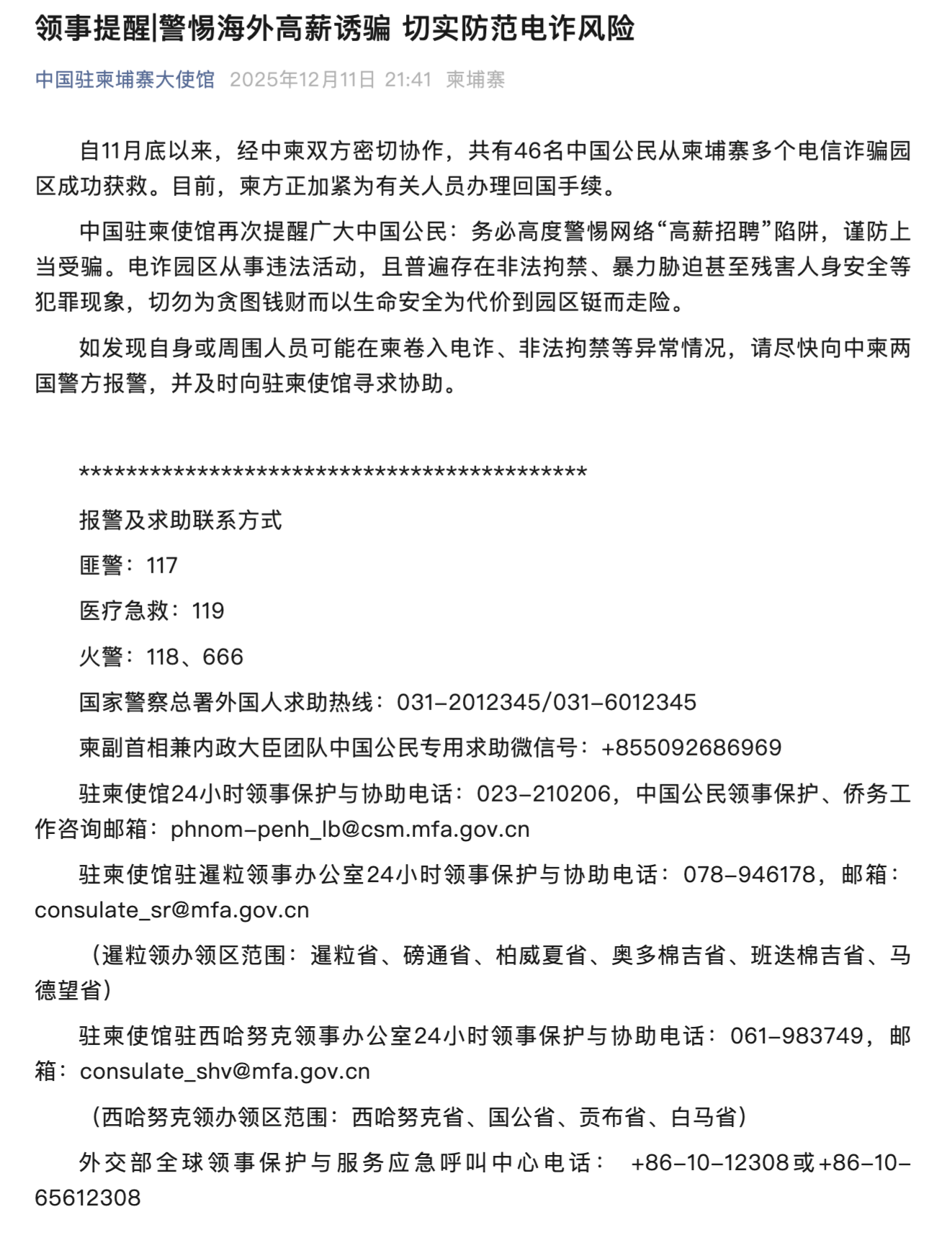 自11月底以来,经中柬双方密切协作,共有46名中国公民从柬埔寨多个电信诈骗园区成功获救。目前,柬方正加紧为有关人员办理回国手续。