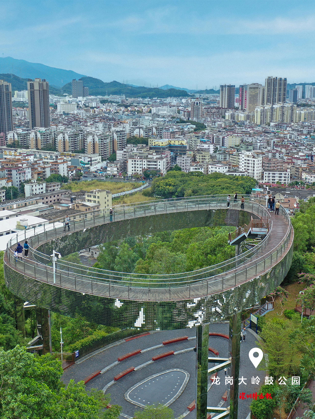 微雨朦胧中,市民漫步于龙岗大岭鼓公园观光廊桥。拾级而上,由万片镜面构筑的“天空之盾”廊桥,在氤氲水汽中若隐若现。风起时,镜片轻摇,反射出城市与天光的万千碎片,形成极具未来感的独特视觉效果,吸引市民前来打卡。登临廊桥,雨雾轻笼下的龙岗城市画卷在眼前温柔铺展。环顾四周,山色空濛,楼影绰约,都市的脉搏与自然的呼吸在此刻同频。