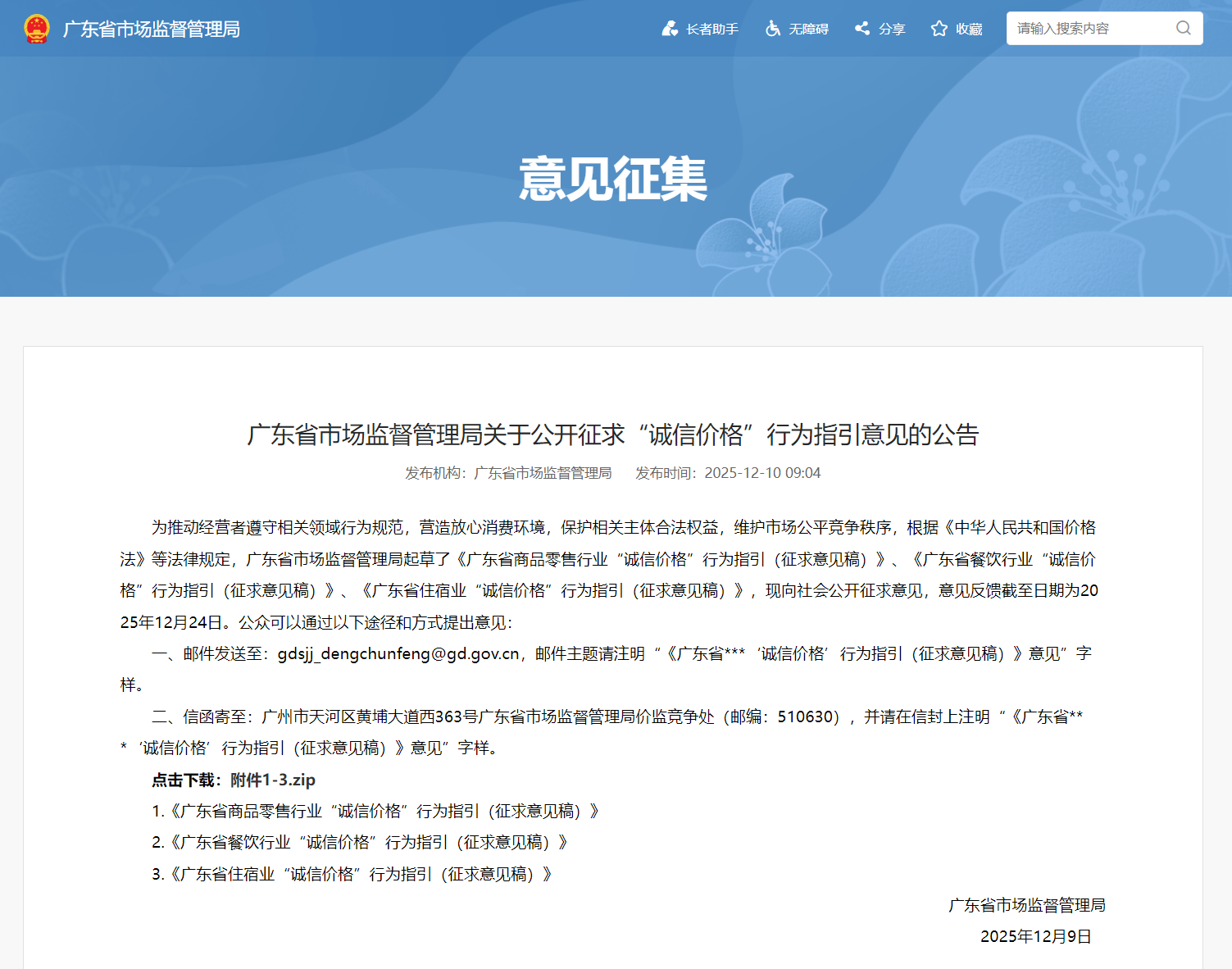 近日,记者从广东省市场监督管理局了解到,根据《中华人民共和国价格法》等法律规定,该局起草了《广东省商品零售行业“诚信价格”行为指引(征求意见稿)》《广东省餐饮行业“诚信价格”行为指引(征求意见稿)》《广东省住宿业“诚信价格”行为指引(征求意见稿)》,相关规定明确了若干事项,正向社会公开征求意见。其中,对消费者关注的茶位费、服务费、价格标示、虚假价格等皆有相关规定。
