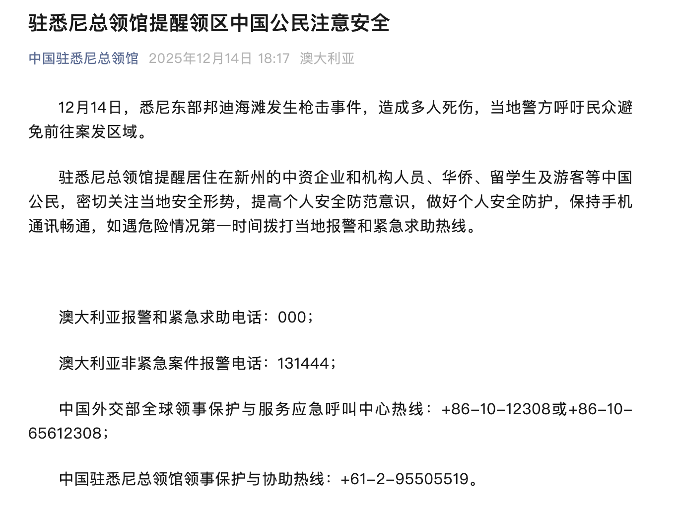 当地时间12月14日,中国驻悉尼总领馆发布通知提醒领区中国公民注意安全。