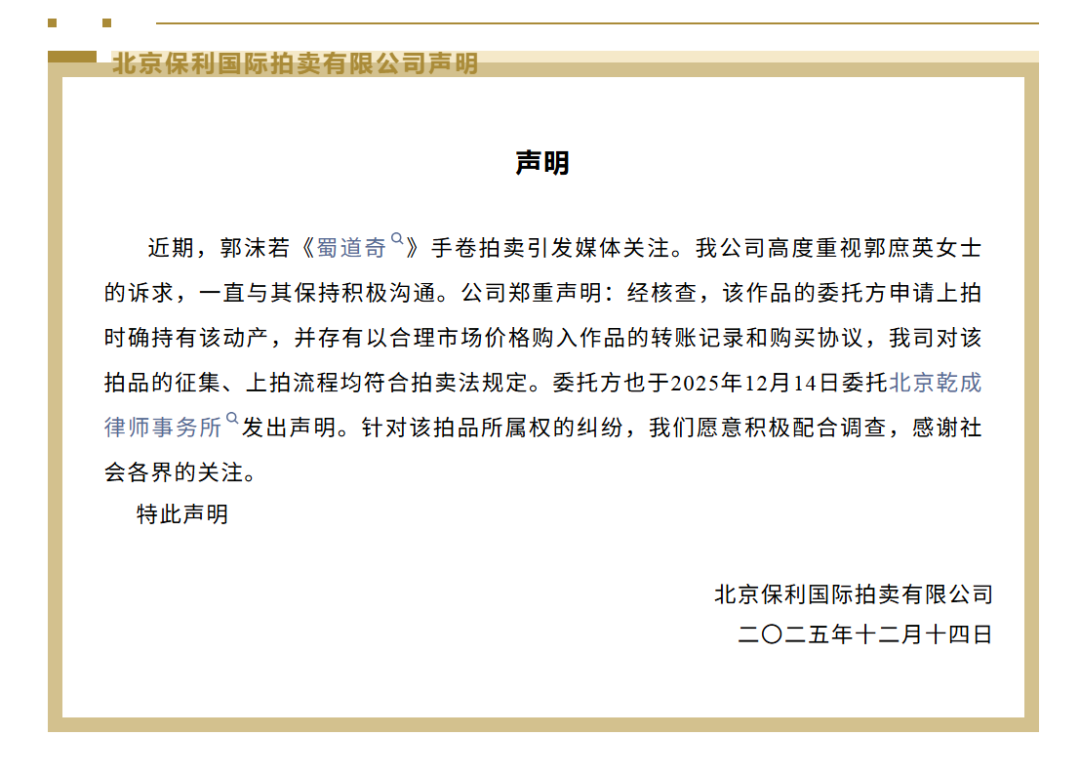 近期,郭沫若《蜀道奇》手卷拍卖引发媒体关注。我公司高度重视郭庶英女士的诉求,一直与其保持积极沟通。公司郑重声明:经核查,该作品的委托方申请上拍时确持有该动产,并存有以合理市场价格购入作品的转账记录和购买协议,我司对该拍品的征集、上拍流程均符合拍卖法规定。委托方也于2025年12月14日委托北京乾成律师事务所“发出声明。针对该拍品所属权的纠纷,我们愿意积极配合调查,感谢社会各界的关注。