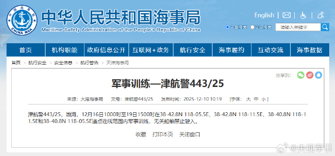 大港海事局发布航行警告,12月16日10时至19日15时,渤海部分海域进行军事训练,无关船舶禁止驶入。
