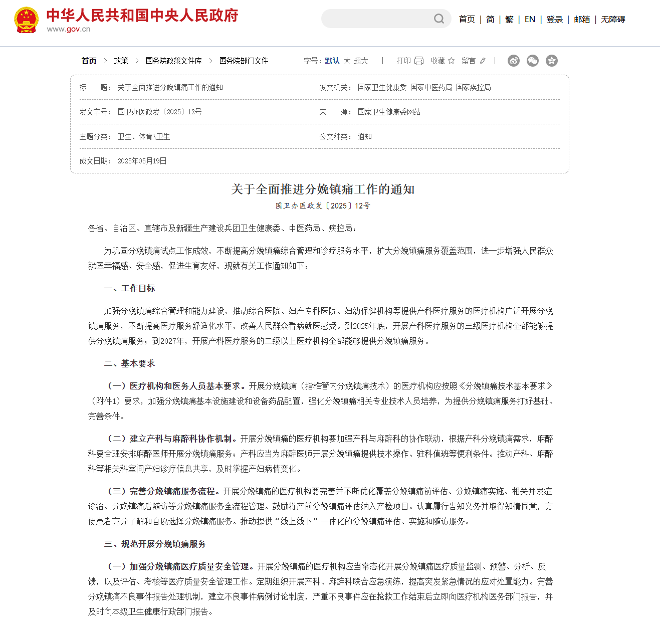 据悉,分娩镇痛在北上广等一线城市的普及率大概在70%~90%,中西部地区县域医院的普及率还不足20%,全国平均水平在30%左右。国家卫健委、国家中医药局和国家疾控局在今年5月联合发布了《关于全面推进分娩镇痛工作的通知》,通过相关政策的支持与医疗技术的普及,提升母婴健康保障水平。