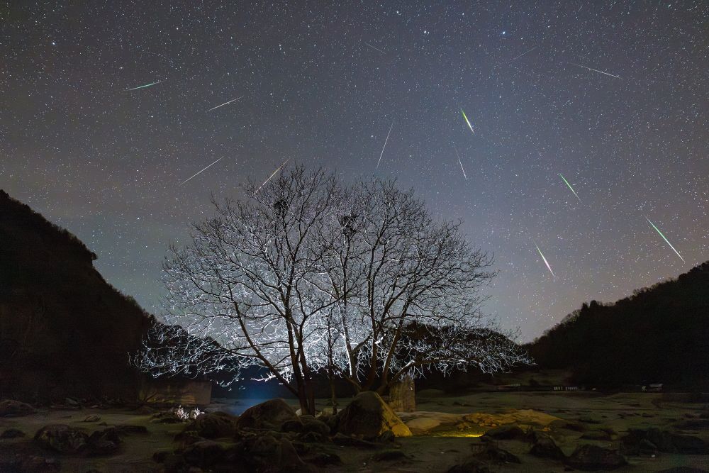 2023年11月19日,在浙江湖州市安吉县拍摄的狮子座流星雨(多张叠加)。(罗弘扬摄,星联CSVA供图)