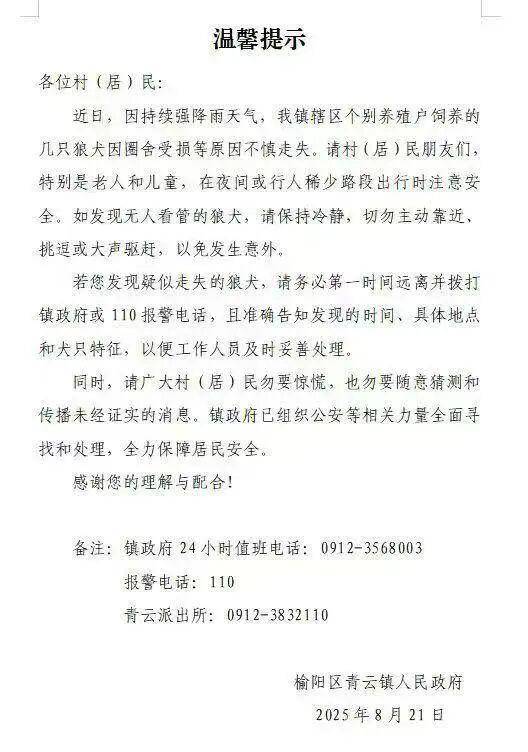 据大风新闻此前报道,8月21日,陕西榆林市榆阳区青云镇政府发布“温馨提示”称,养殖户饲养的几只狼犬因圈舍受损不慎走失,提醒大家注意出行安全。榆阳区青云镇政府一名工作人员澄清说,跑走的是狼犬,并非狼。8月22日,记者从当地权威部门获悉,目前大部分已经找回。