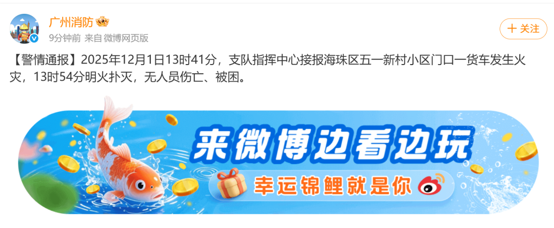 12月1日,广州沙园地铁站附近突发火情。14时35分,广州消防发布警情通报:2025年12月1日13时41分,支队指挥中心接报海珠区五一新村小区门口一货车发生火灾,13时54分明火扑灭,无人员伤亡、被困。