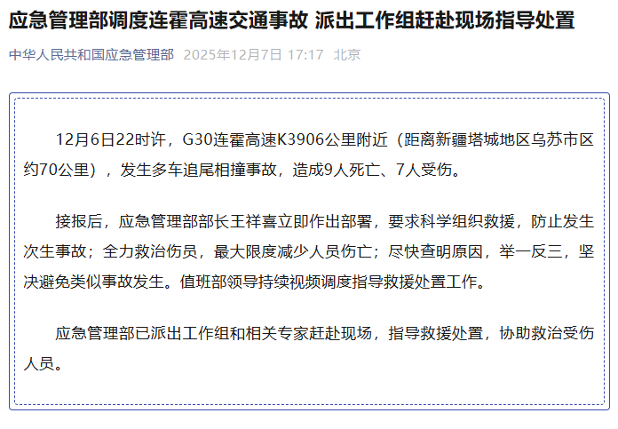 12月6日22时许,G30连霍高速K3906公里附近(距离新疆塔城地区乌苏市区约70公里),发生多车追尾相撞事故,造成9人死亡、7人受伤。